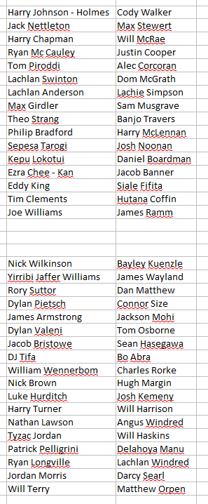 Bo Abra, James Armstrong, Jacob Bristowe, Nick Brown, Will Harrison, Sean Hasegawa, Will Haskins, Luke Hurditch, Tyzac Jordan, Josh Kemeny, Bayley Kuenzle, Nathan Lawson, Ryan Longville, Delahoya Manu, Hugh Margin, Dan Matthew, Jackson Mohi, Jordan Morris, Matthew Orpa, Tom Osborne, Patrick Pelligrini, Dylan Pietsch, Charles Rorke, Darcy Searl, Connor Size, Rory Suttor, Will Terry, DJ Tifa, Harry Turner, Dylan Valeni, James Wayland, William Wennerbom, Nick Wilkinson, Yirribi Jaffer Williams, Angus Windred, Lachlan Windred.