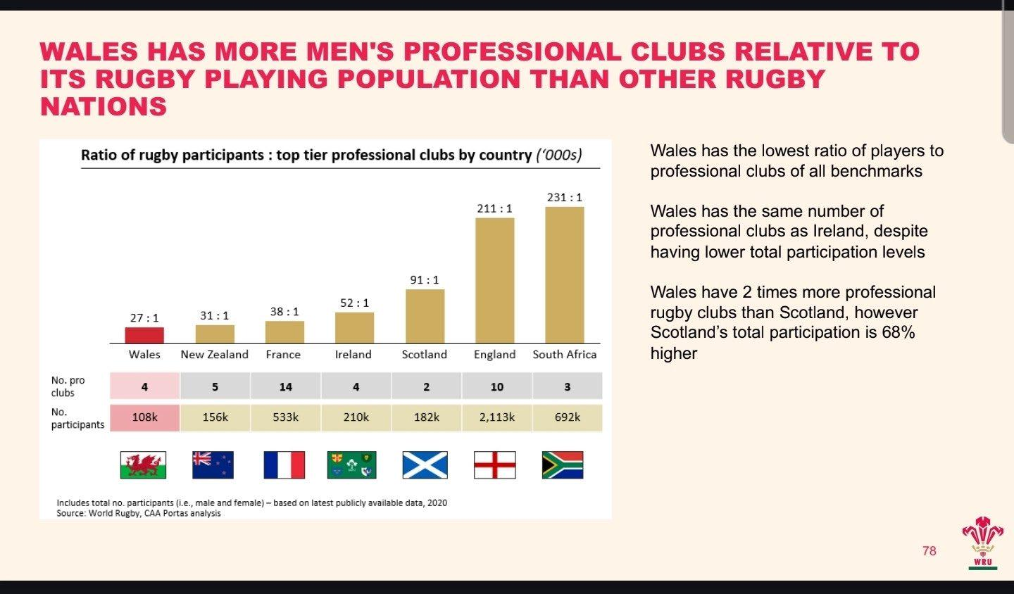 Wait, is this graph saying that over 2 million people are playing rugby in England alone? Surely that can't be right. And noting the 4 teams in the URC for South Africa, aren't the Currie Cup squads that don't play URC also professional? That will affect the SA ratio significantly.Some interesting tidbits coming out in relation to this WRU review of the number of teams, FWIW South Africa have 4 teams in the URC.. not 3
