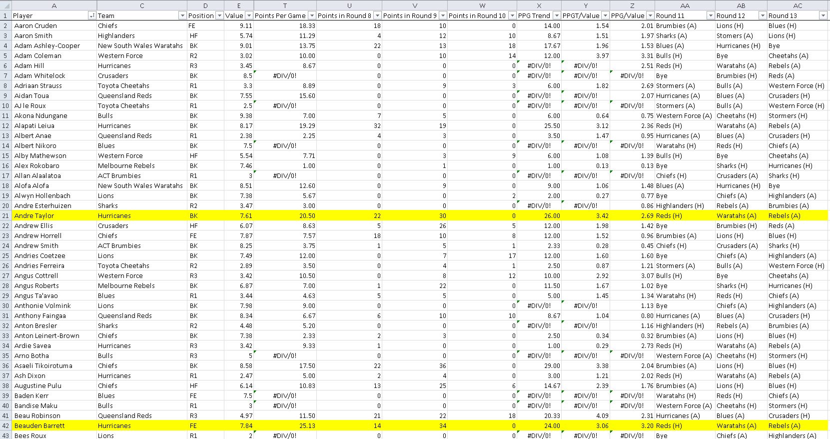 Moved back up to 23rd in Fox this week but dropped to equal 1st in ARU. That Read/Kerr-Barlow collision really mucked up both teams. Fingers crossed Lappies is fit and raring again this week.