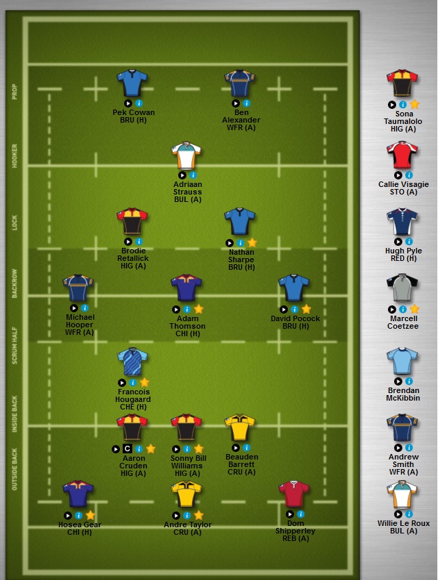Backrow: Pierre Spies, Hooper, Kolisi, (CJ Stander) - CJ is on the bench for the Bulls so I felt I needed someone who'll be out there longer, Spies has been going ok with his points tally.
