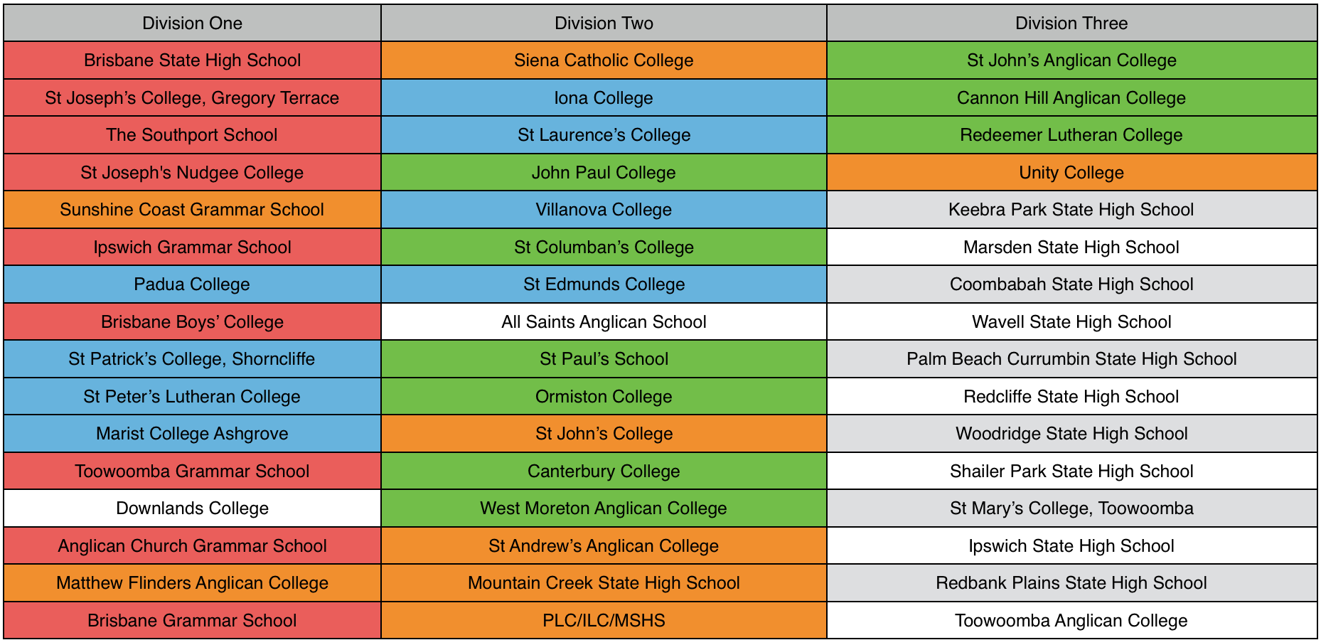 Pool A: State High, Sunny Coast Grammar, St Pat's, and Downlands College