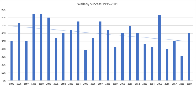 For the most part, the best years for results are the world cup years.This is the Wallaby Success in the pro-era (hopefully this doesn't contain errors as I typed it up rather fast). Looks rather downward to me?