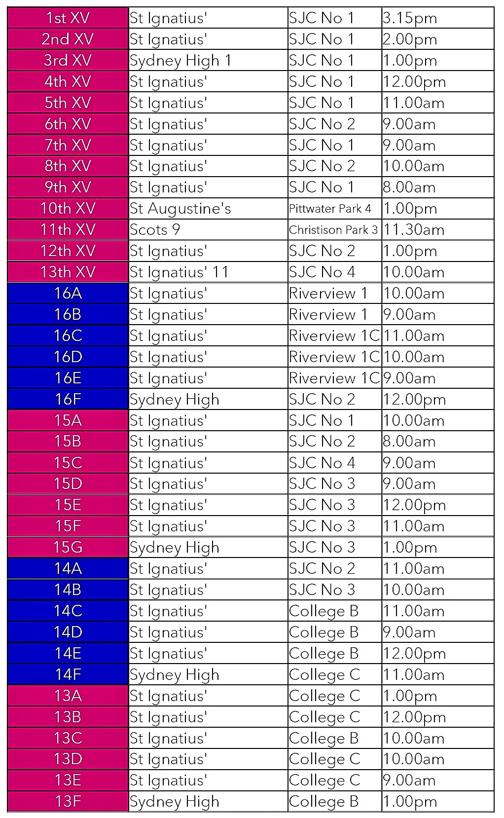 From my understanding 16As at 10, 3rds 12 against tas, 2nds at 2 and first at 3:15