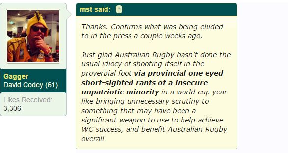 Just glad Australian Rugby hasn't done the usual idiocy of shooting itself in the proverbial foot via provincial one eyed short-sighted rants of a insecure unpatriotic minority in a world cup year like bringing unnecessary scrutiny to something that may have been a significant weapon to use to help achieve WC success, and benefit Australian Rugby overall.