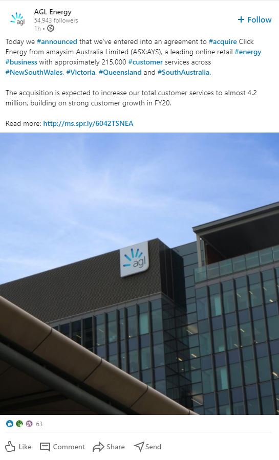 AGL will likely retain the ‘Click Energy’ brand, they will just be owned by AGL. Click will still be looking at its own sponsorship and marketing opportunities.