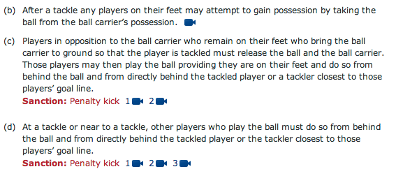 In particular (c) envisages a player being brought to ground by players who do not leave their feet and yet the player brought to ground is "tackled".