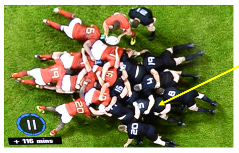 All I can presume is that Whitlock is effecting a crotch bind on both the loose head prop and the hooker (treating the hooker like a prop) in an effort to develop more power and also attempt a wheel.
