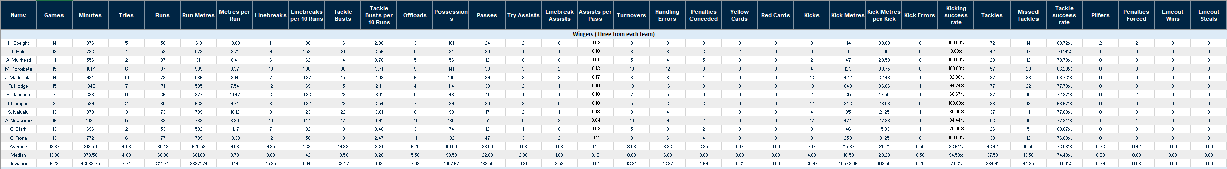 Here are my stats on the three wingers with the most minutes at each Super club this season. Maddocks has the second-fewest metres per run, linebreaks, and tackle busts per ten runs, and the worst tackle success rate. His best (and only noteworthy) stat is tries scored (for which Slim (I think accurately) credits the inside backs).