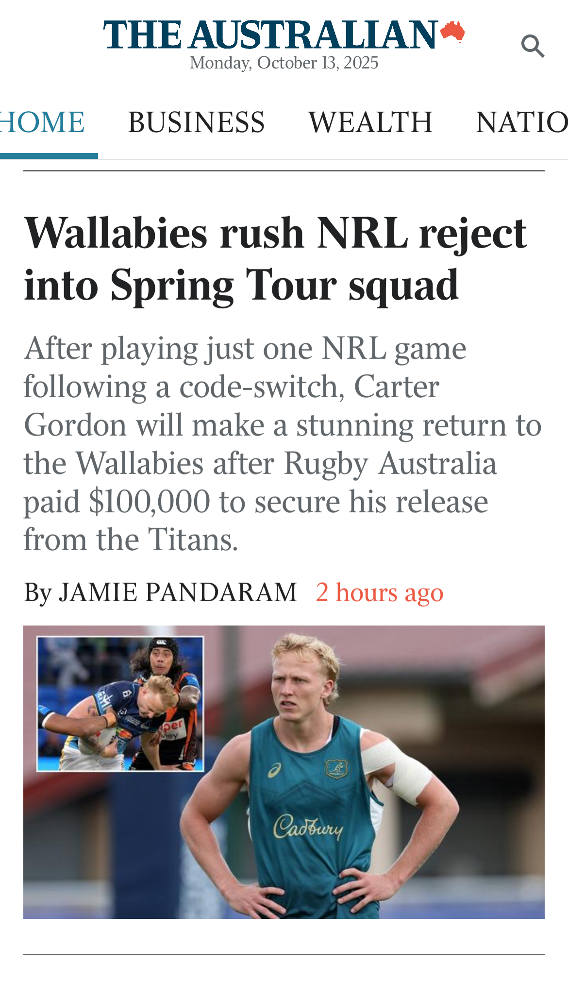 Lynagh been left behind because his injuredJOC (James O'Connor) (James O'Connor) is over there. They will call on him if there is an injury no doubt. How they are backing Edmed over Donaldson is what I don't understand. Blooding Lynagh with the pressure of the Lions series has set him back and the decision has been made now to bring in a new answer. Faster than a speeding mullet... it's the one game NRL man and former Wallaby... Carter Gordon! Wishing the Wallabies luck for the tour. Hopefully they play well .