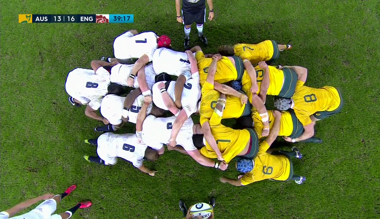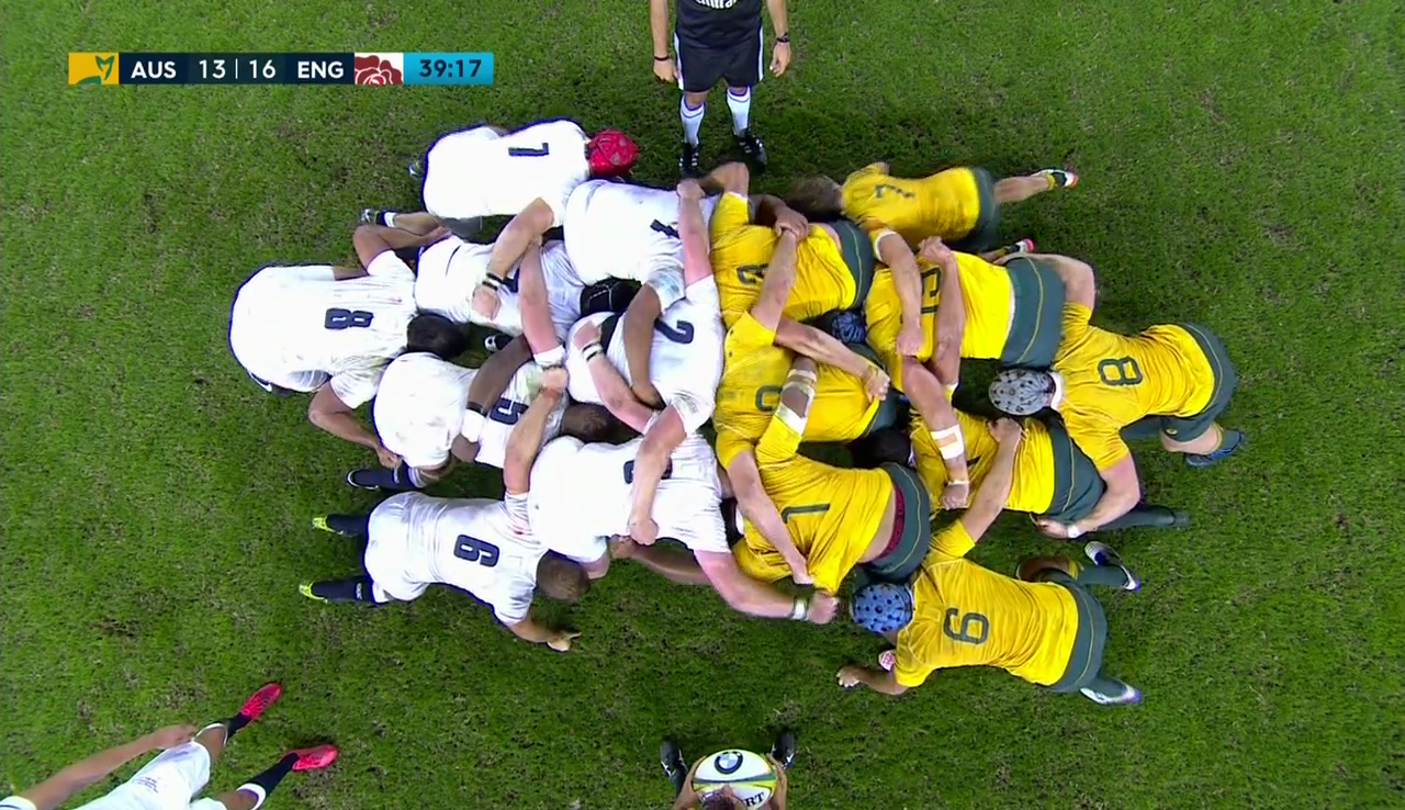 The England LH is quite clearly binding on the arm of the Wallaby hooker. Don't the laws say he has to bind on the jersey of the opposite prop?