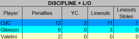 - I didn't expect it but Nick is the most ill-disciplined by far, though he is actually used in the lineout much more (once a game).