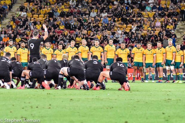 It was a half of two halves. The ABs started at a pace the G&G couldn’t match and they were soon on the scoreboard. Under penalty advantage on the attack, slick back play saw Jordan fire a final pass out to Clarke who dots down in the corner. Barrett’s conversion hits the left upright and comes back out but New Zealand lead by five. Australia then have their first spell of possession in the match and make good progress into the New Zealand 22. A tackle off the ball and the G&G have a penalty which JOC converts. It’s 5-3 to the ABs. Starved of possession and under the pump the penalties start to mount. Roigard takes a quick penalty and in their 22 Wilson is penalised for a no arms tackle and Barrett takes an easy three pointer. It’s 8-3. The ABs are quickly back on attack. Savea sent Carter away for a second try which Barrett failed to convert. Things are not looking good when McDermott is forced to retire with Lonergan taking his place. To make matters worse Cam Roigard slips over for a third try which is converted. It’s 20-3 and the Wallabies are struggling. However, relief is at hand. From an attacking lineout in the ABs red zone, Pollard goes over, JOC converts and we’re coming back. It’s 20-10. At last the G&G find their mojo, bending the ABs line to create quick ball for JOC. Good hands find Ikitau again on a wicked angle and wing Harry Potter is there to pick up the offload and cross for a much needed score. JOC converts and we go into HT with the score 20-17 and all to play for.