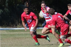 Liam McNamara pawing off defenders and setting up try