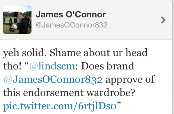 The Social Pages can admit when it’s wrong. And we’ve been dead wrong about James O’Connor. For a number of weeks now, we’ve been holding James O’Connor up as an archetype of using Twitter to take advantage of professional-player-induced attractiveness to the fairer sex before becoming just another former player struggling to stop the insidious advance of the corporate-lunch-kilograms.