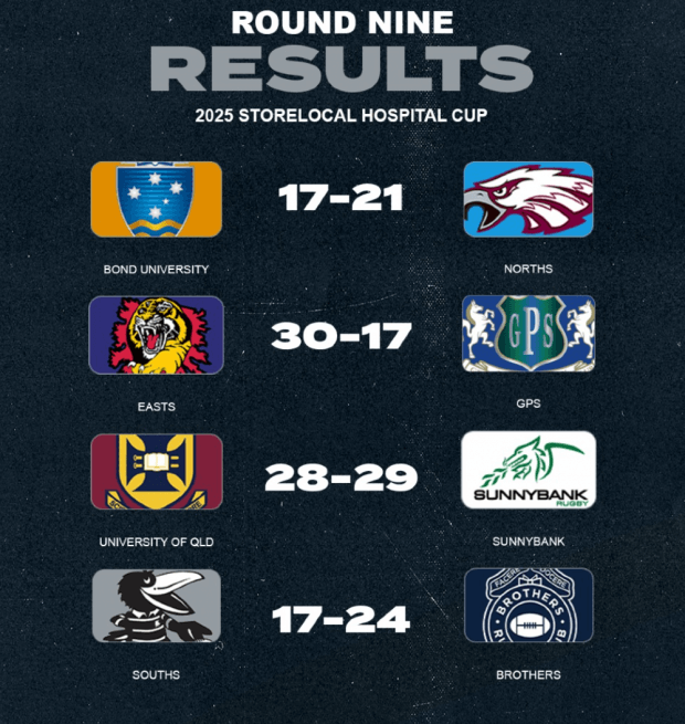 Which means that after 9 rounds of the Hospital Cup we see Easts and Brothers at the top of the table on 39 and 35 points, respectively, and Wests and Bond Uni rounding out the top 4.
