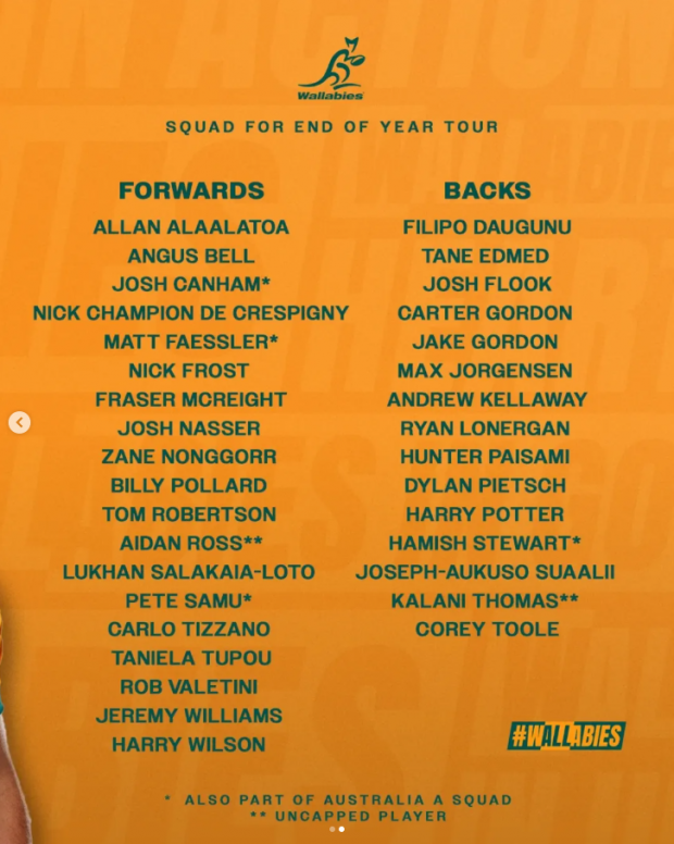 Wallabies Squad for end of year tour