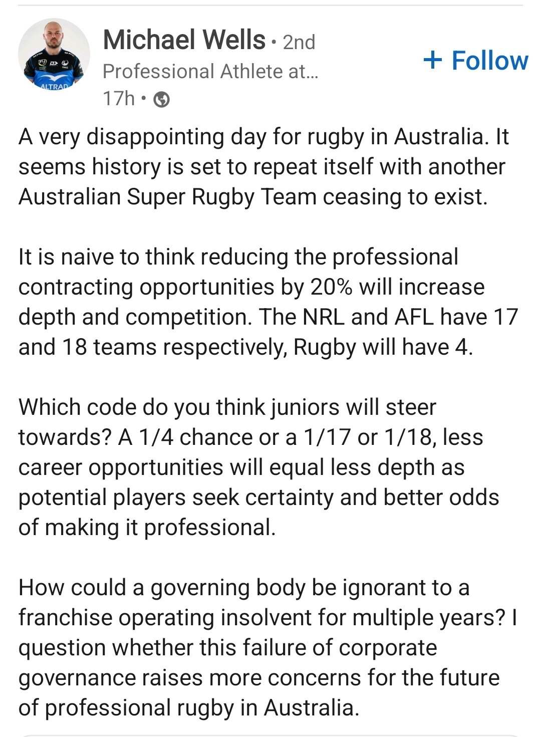 The Rebels probably should have followed the Tahs prudent policy of publishing their accountsShould the Rebels have followed the Waratahs prudent spending…..oh sorry, 4.8m loss in last released figures, 400k on a crocked 18 year old and 5 odd million on Suaili.