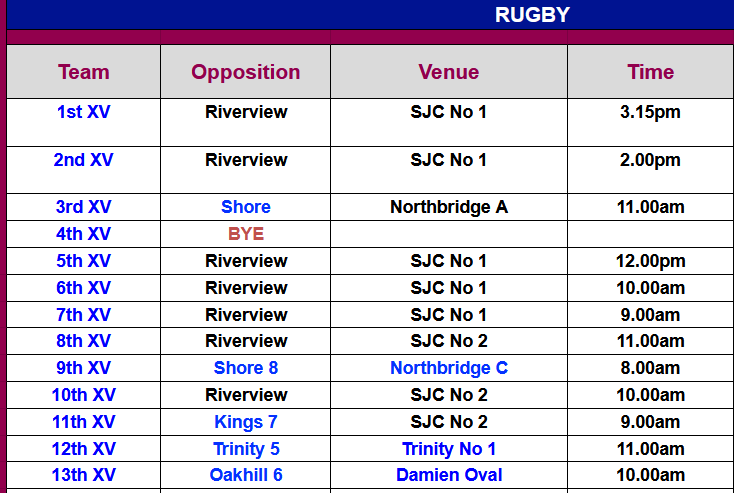 for those wondering what's the go with the BYE for the 4th XV, it's because View 4ths are playing Grammar 2nds in an unofficial "comp" which now includes Grammar's 2nds with the other 6 schools (curtain-raiser in the 3rds comp). This means 7 teams, so a bye is involved. Similar story with the 14Cs - View 14Cs play Grammar 14As, which leaves Joeys 14Cs with a Bye.