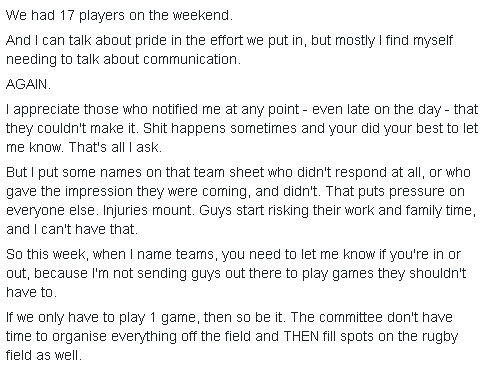 I've tried molly-coddling, banter, gentle ribbing, appealing to better natures, the best post-match feed of any club, Presidential Free Beer, and NOT having to play First Grade. As it is, anyone wanting to take offence to this: