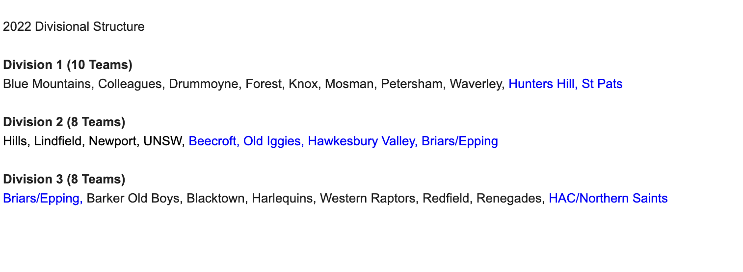 Division 2 (4 grades & colts)- Petersham, St Patricks, Newport, UNSW, Hills, Old Ignatians, Lindfield, (mystery club from point 1 or Western Raptors).