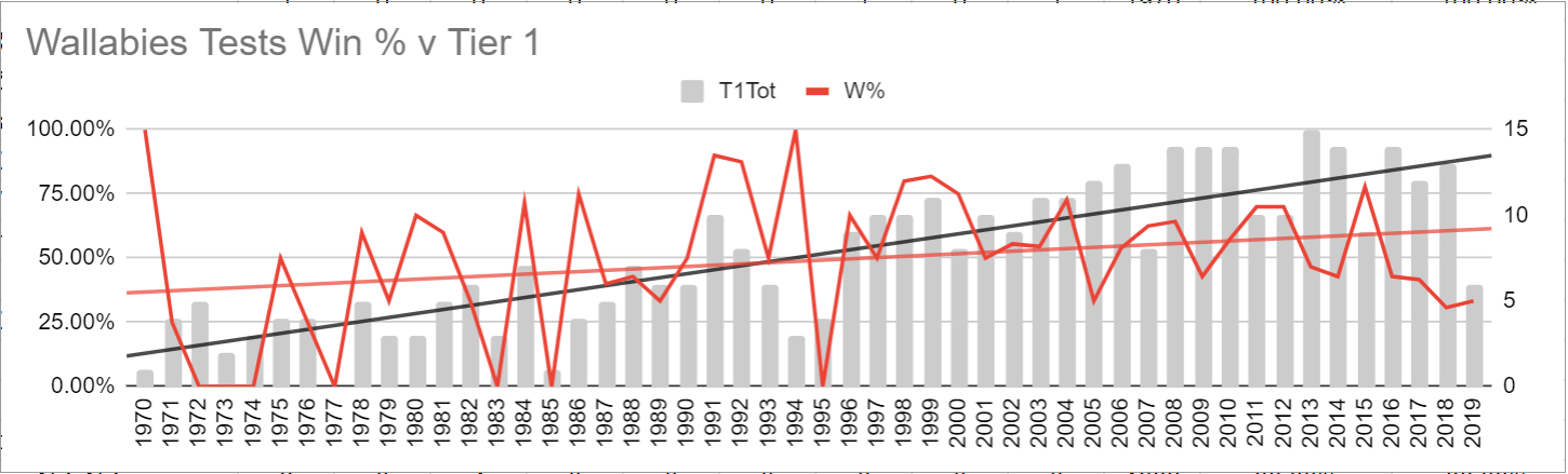 I've bored you enough :) but if you look just at the 32 years you've nominated, we're 55% win against Tier 1 sides. Not bad BUT if you look at the 50 years from 1970-2019, we're 49%. If I go further back, I suspect it'll get worse, and the forward trend isn't much better. Take out that slice of time in the 90s where we got rubbish inbound tours from NH sides, and that percentage slides even further.