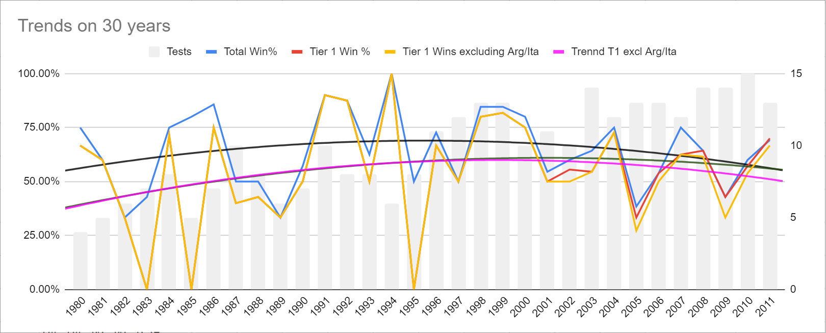 Graph 3: Trends on All Wins v T1 Wins v T1 excluding Italy and Argentina - looking purely at the 1980-2011 period, this line graph (confusingly) breaks down the percentage and trends. You can see the curve is heading downward again even prior to Rennie, and like a badly made bridge is suspended on a couple of high points in the mid-80s, early 90s, and turn of the century.