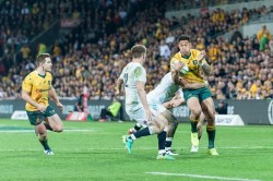 Wallabies’ fullback, Israel Folau is tackled, as flyhalf, Bernard Foley, screams for the ball.