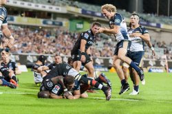 Josh Mann-Rea crashes overfrom the back of a Brumbies Rugby maul, the score the second Brumbies’ try of the night.